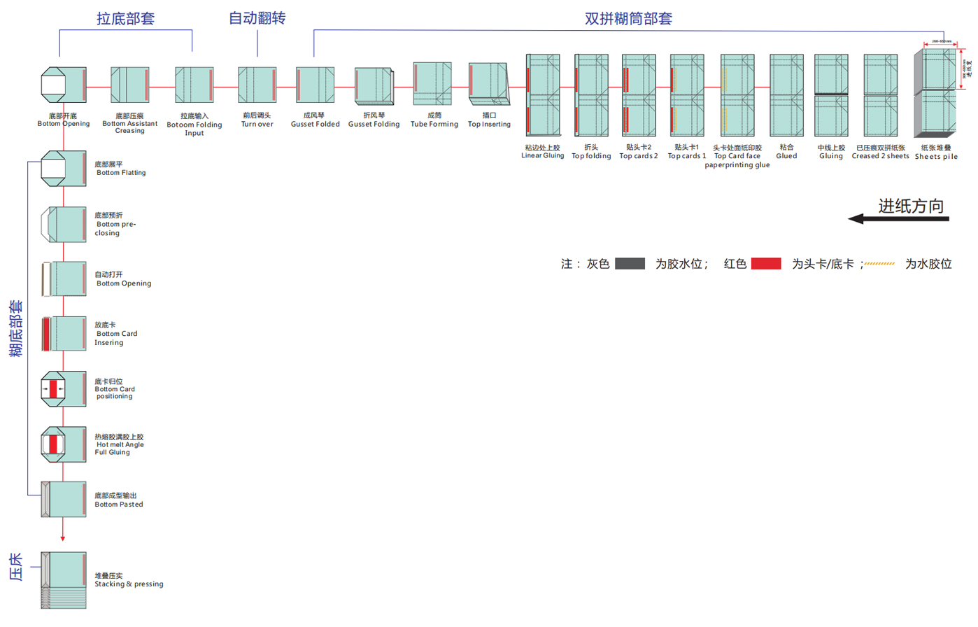 5,底部沿袋底邊緣上膠, 實現(xiàn)紙袋上膠完美貼合, 不易開底,增強紙袋的沉重能力;