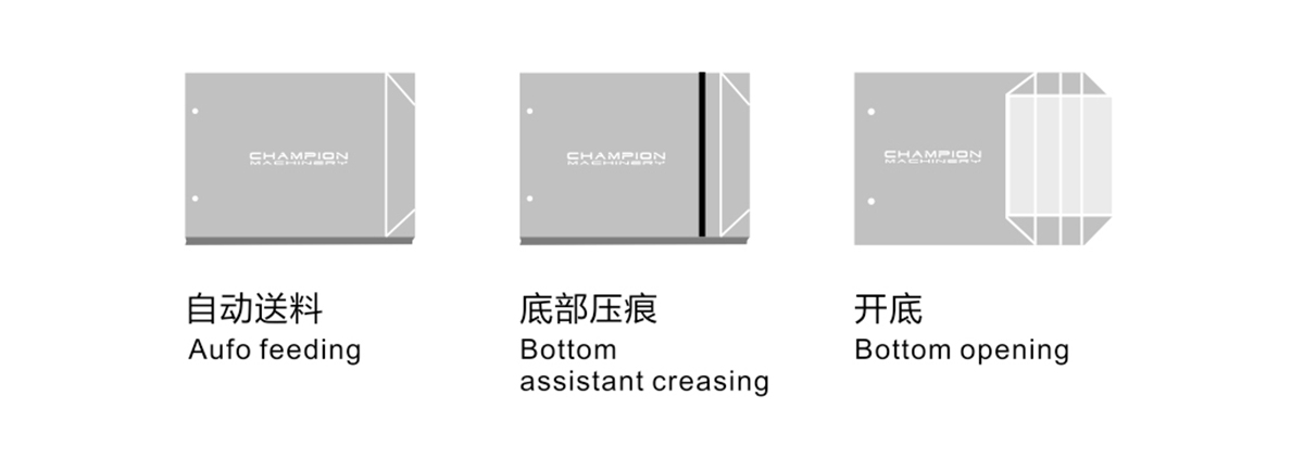 該方案是以單張紙、頭卡和底卡為原料,由飛達(dá)進(jìn)行全自動(dòng)送紙,經(jīng)由輸紙平臺(tái)進(jìn)行輸送,然后用前規(guī)、側(cè)規(guī)進(jìn)行單張準(zhǔn)確定位,送入壓線部壓豎線。自動(dòng)涂膠(可同時(shí)噴熱熔膠),成型,自動(dòng)折風(fēng)琴,自動(dòng)壓筒,再經(jīng)由推規(guī)定位,送入壓橫線裝置壓橫線,再進(jìn)入拉底,上底膠,底部成型,一次完成。本機(jī)采用觸摸屏控制,制袋精度髙,速度快,全過程自動(dòng)化,生產(chǎn)效率與傳統(tǒng)手工制作相比提供幾十倍,是加工出口型手提袋,髙檔奢侈品手提袋的理想全自動(dòng)設(shè)備。